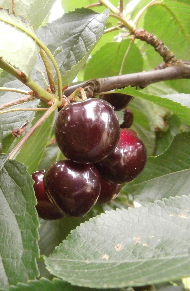 De Prunus cerasus ‘Dubbele Meikers’ geeft middelgrote donkerrode kersen met een iets wat zuurdere smaak.