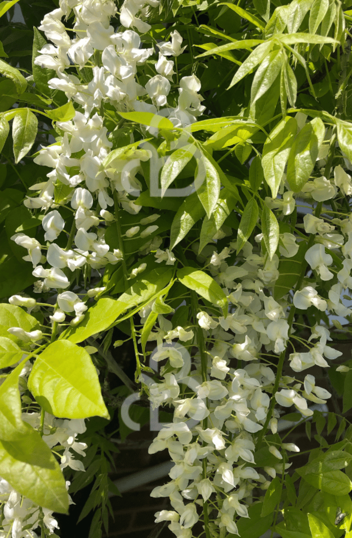 Rond april t/m juni bloeit de wisteria floribunda ‘Alba’ met volle en lange trossen kleine witte bloemetjes. De bloemen zijn licht geurend.
